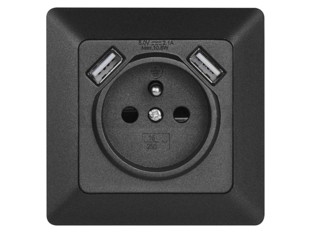Zásuvka jednonásobná s ochranným kolíkem s USB nabíjením. USB výstup 5 V DC 2,1 A max. Vestavná hloubka 35 mm. Doporučuje se použití instalačních krabic o hloubce min. 40 mm a hlubších. Nelze používat k datovému přenosu.