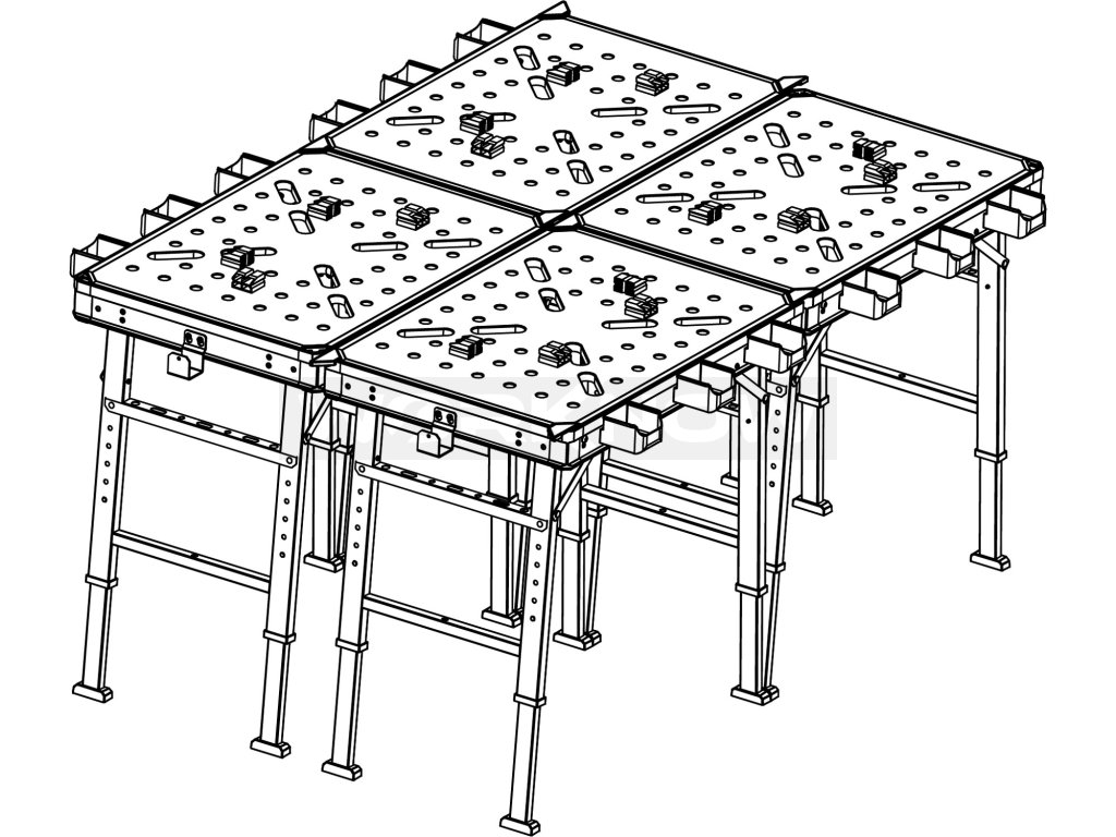 - pevná základní kovová konstrukce s deskou z MDF zasazenou do hliníkového rámu poskytuje prac. plochu 85x60cm o nosnosti 450kg s manipulačními výřezy a 20mm otvory, jak pro dodávané vymezovací/opěrné zarážky tak pro libovolné upínací svěrky
