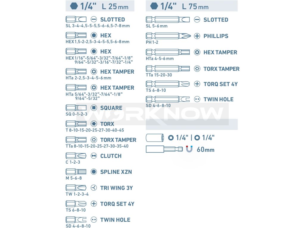 | Doplňující parametr: | 79ks 25mm hrotů: (-) 3-4-4,5-5-5,5-6-6,5-7-8mm, HEX 1,5-2-2,5-3-4-5-5,5-6-8mm, HEX-Ta 2-2,5-3-4-5-6, HEX 1/16"-5/64"-3/32"-7/64" |