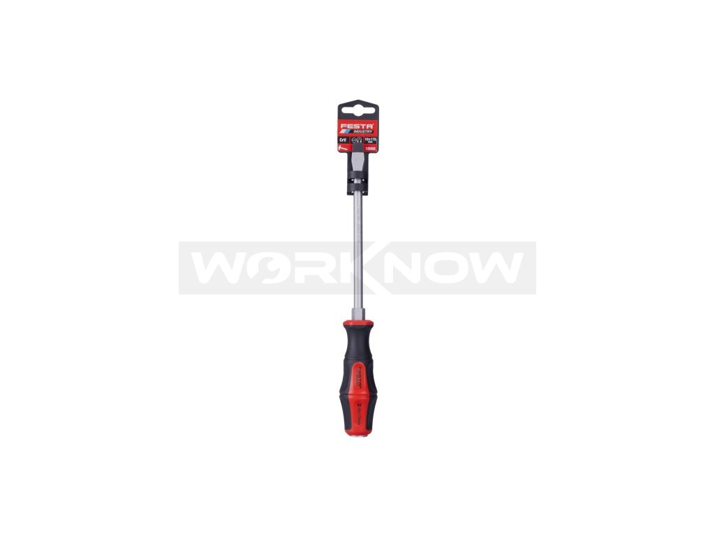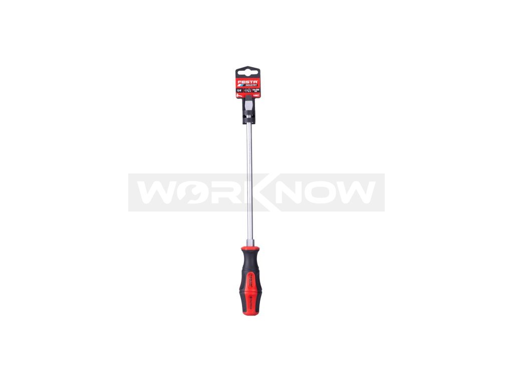 Kovový dřík šroubováku FESTA je vyroben z kvalitní chromvanadiové oceli, kalený hrot je magnetický, u rukojeti je šestihran pro použití klíče, kombinace polypropylenu a pryže na rukojeti a její ergonomický tvar zaručuje dobré antiskluzové vlastnosti a dobrou odolnost vůči mazadlům a chemikáliím.