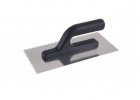 Hladítko nerezové rovné 270x125 mm s plastovou ručkou, tl. plechu 0,7 mm. Ostří je perfektně vytvarováno, je vyrobeno z tvrzené nerezové oceli. Používá se zejména k nanášení lepidel pod obklady a dlažby, dále pak k nanášení stěrek, štuků, omítek, tmelů a dalších stavebních hmot.