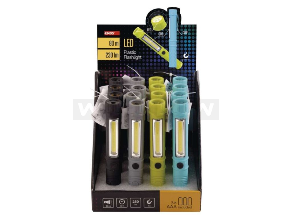 COB LED + LED ruční svítilna P3897, 230 lm, 3× AAA, 16 ks, display box