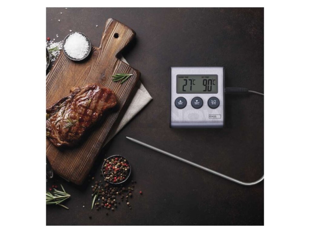 Připravte si dokonalé pokrmy díky přesnému digitálnímu kuchyňskému teploměru s minutkou. Teploměr E2157 měří sondou teplotu přímo uvnitř masa nebo jakýchkoli jiných potravinách. Je to tedy neocenitelný pomocník při venkovním grilování i domácím pečení, zejména masitých dobrot. Teploměr pracuje v širokém rozsahu měření teploty od -20 °C až do +250 °C.