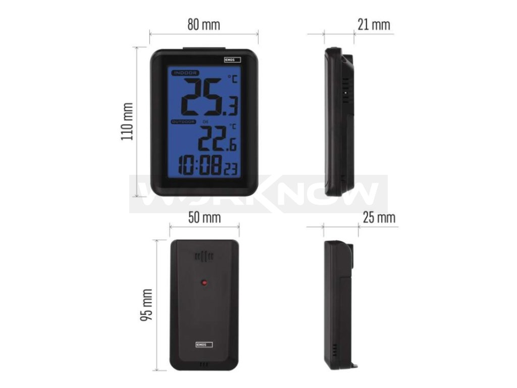 Bezdrátový teploměr měří aktuální teplotu v místnosti v rozmezí 0 °C až + 50 °C a ve venkovních prostorech v rozmezí od -30 °C až + 50 °C. Přístroj také zaznamenává nejnišší a nejvyšší naměřené hodnoty a ukládá je pro pozdější kontrolu.