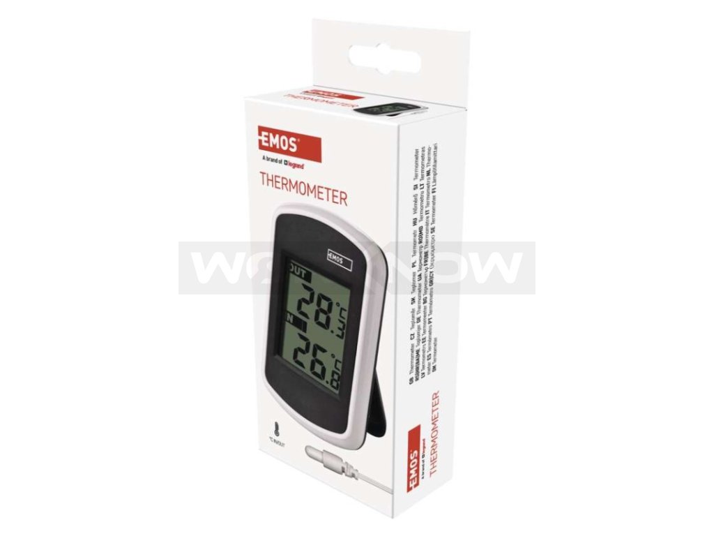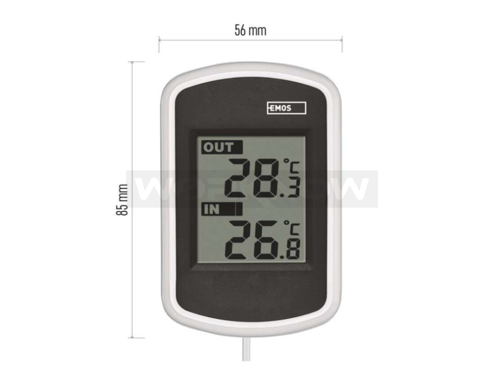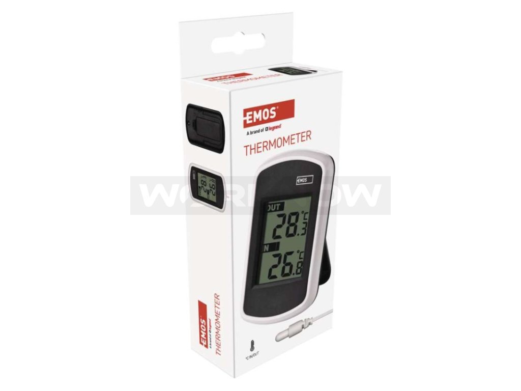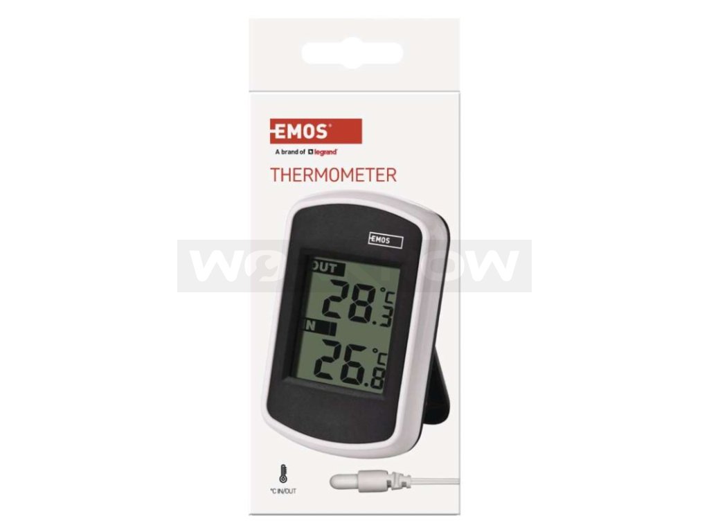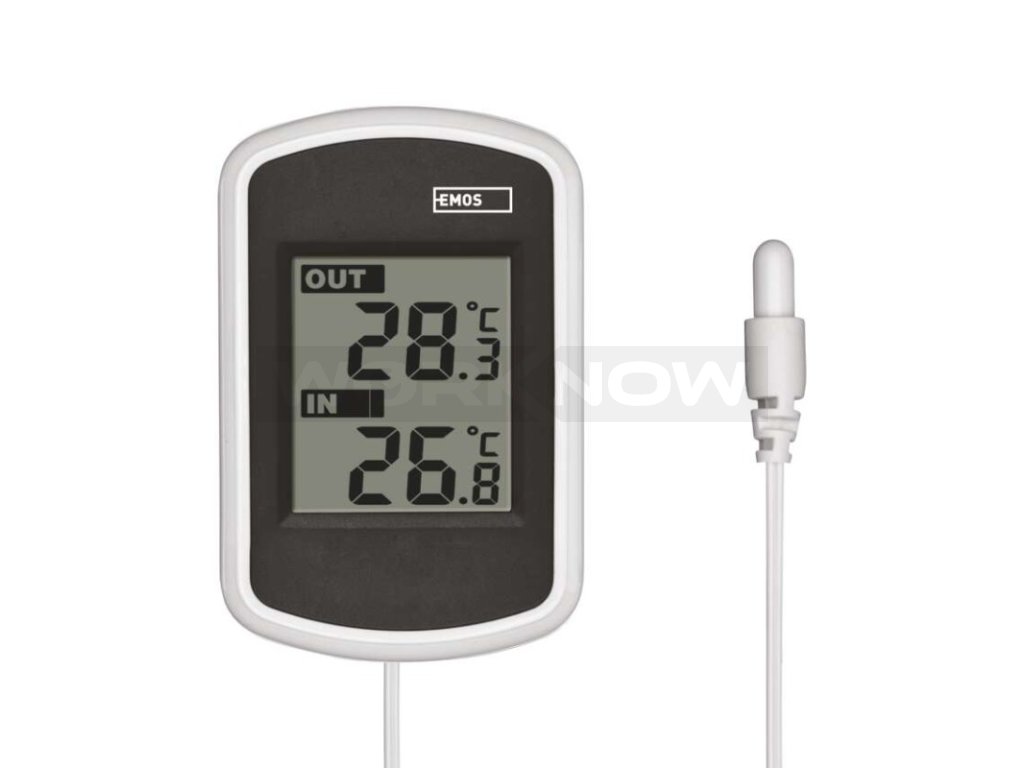 Drátový teploměr se zobrazením venkovní a vnitřní teploty. Teploměr má drátovou sondu v délce 2 m.
