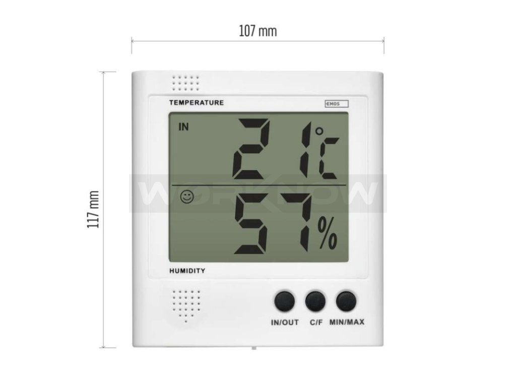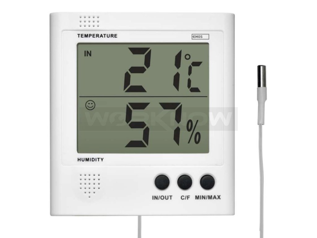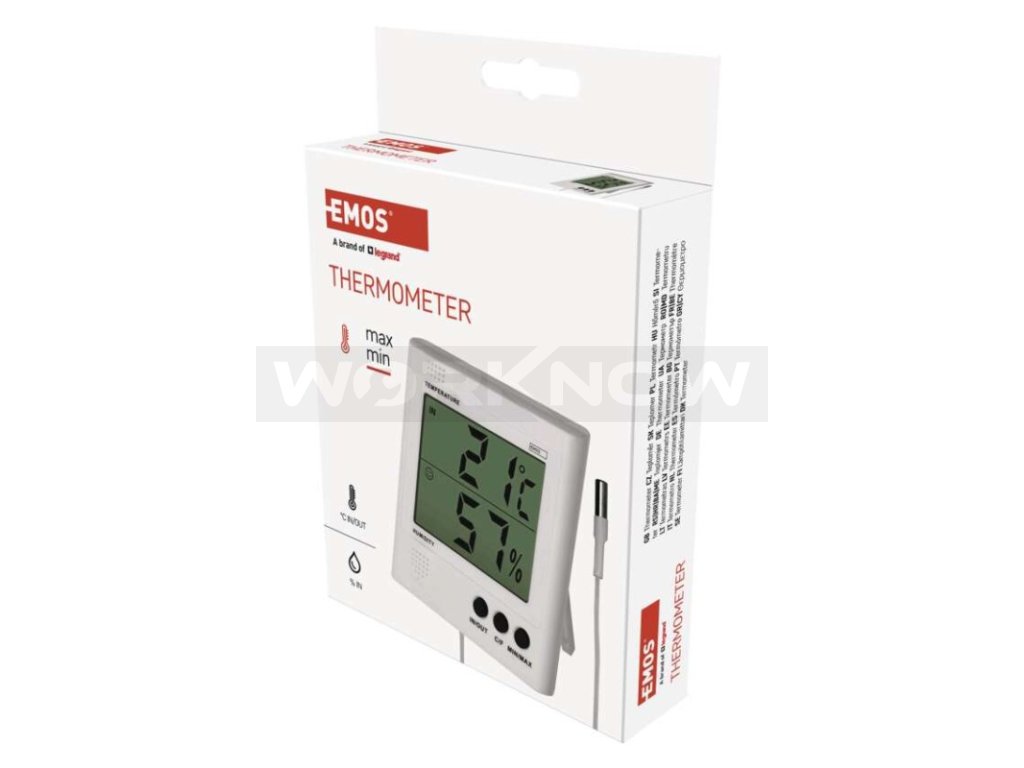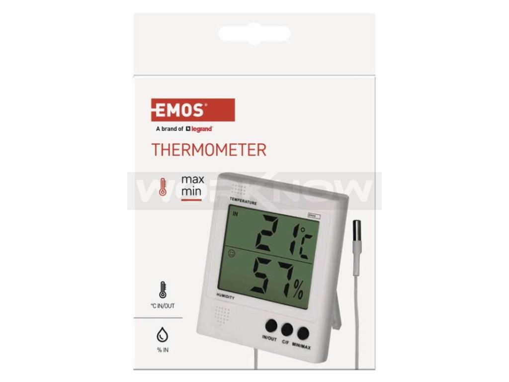 Digitální teploměr s drátovou sondou. Teploměr zaznamenává vnitřní a venkovní teplotu, vnitřní vlhkost, min. a max. teplotu a varuje před námrazou. Sonda teploměru má délku 2 m.