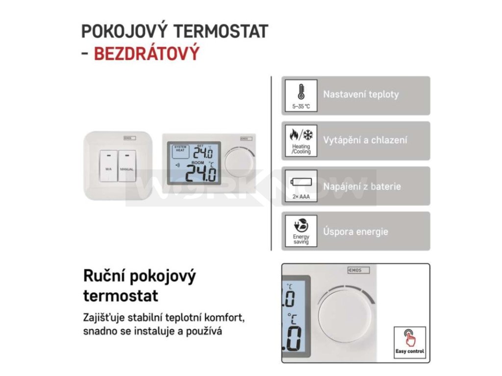 Mějte teplotu i náklady na vytápění a chlazení pod kontrolou. Bezdrátový pokojový termostat reguluje topicí systém i klimatizaci a hlídá ideální teplotu za vás – v bytě, domě i kanceláři. Umožňuje nastavení teploty od 5 °C do 35 °C a zajišťuje příjemné klima v létě i v zimě. Díky bezdrátovému provedení a dosahu až 100 m dovoluje změnu referenční místnosti podle potřeby. Výhodou je přehledný displej s velkými číslicemi a podsvícením, na kterém odečtete mimo nastavené teploty i aktuální teplotu v místnosti na stupnici od 0 °C až do 40 °C. Snadné a intuitivní ovládání pomocí kolečka zvládne jednoduše celá rodina.