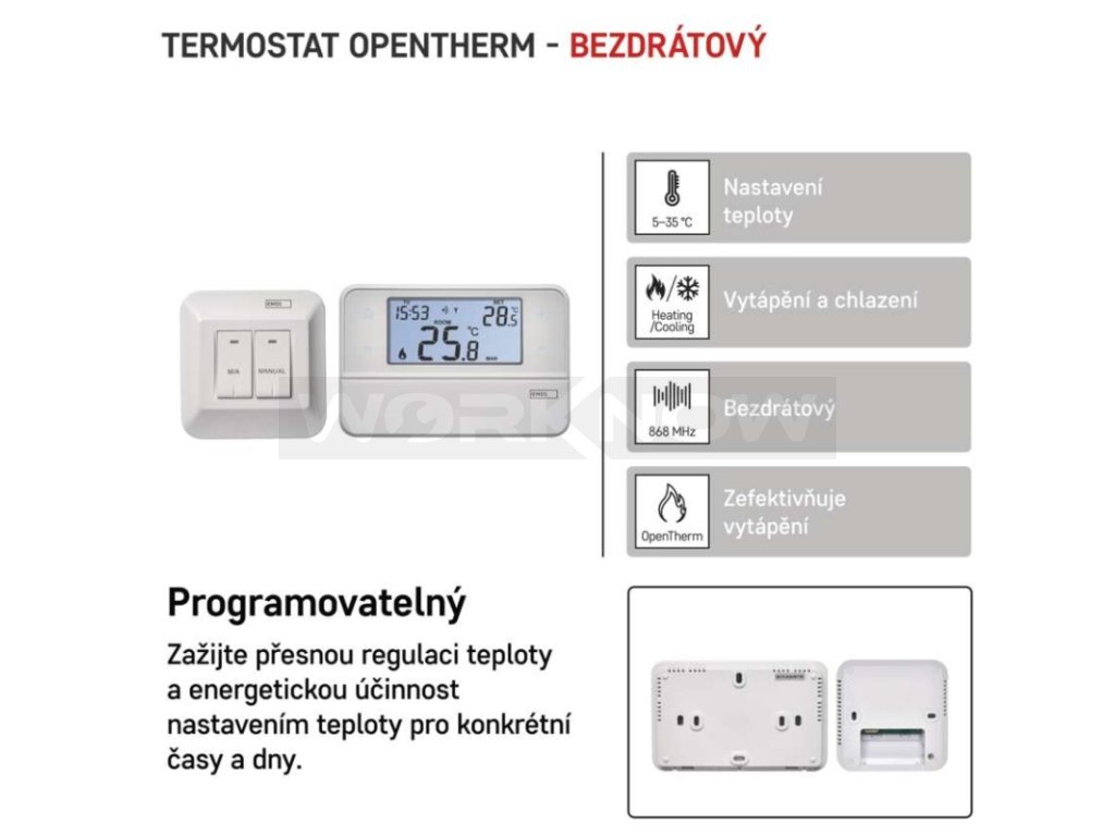 Získejte dokonalý teplotní komfort a kontrolu nad vytápěním a chlazením doma i v kanceláři. Termostat umožňuje spolehlivou regulaci otopných i chladících systémů a programování až šesti teplotních změn denně. Plně se tak přizpůsobí vašemu životnímu rytmu po celý rok. Díky bezdrátovému provedení můžete snadno měnit referenční místnost. Výhodou je podsvícený displej, jednoduché ovládání, nastavení teploty v rozmezí od 5 °C do 35 °C a funkce Prázdniny a Lock. Připojit můžete kotel, který podporuje OpenTherm komunikaci i klasické spínání prostřednictvím spínaného kontaktu (relé).