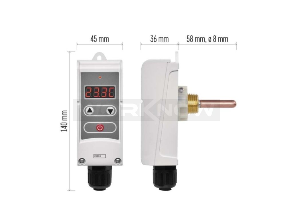 Používá se nejčastěji v kombinaci s bojlerem nebo akumulační nádrží. Čidlo je instalováno přímo na bojler včetně těla termostatu. Možnost zapojení do vytápěcího systému i chladící jednotky. Šetří náklady na vytápění i chlazení. Jednoduché a uživatelsky přívětivé ovládání. Přehledný podsvícený displej. Přesné nastavení teploty díky disleji. Kontrolka sepnutí termostatu (svítí červeně, pokud termostat sepne). Nastavení teploty od 5 °C až do 80 °. Napájení do sítě (230 V). Součástí je gumová průchodka, která slouží k ochraně připojených vodičů. Umožňuje regulaci teploty, hlídání teplotních omezení a funkci poklesu teploty.