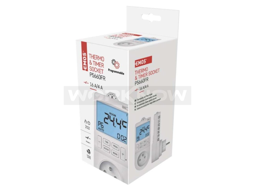 2 v 1 produkt - Zásuvkový termostat s funkcí digitální spínací zásuvky. Verze zásuvky FRENCH.