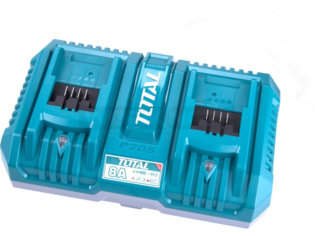 Duální nabíječky jsou určeny k nabíjení akumulátorů 20 V a umožňuje nabíjet dva akumulátory současně (nezávisle na sobě). • Nabíječka nabíjí, sleduje a vyhodnocuje nabíjení každého akumulátoru samostatně nezávisle na druhém akumulátoru. Nabíječkou lze současně nabíjet akumulátory s různými kapacitami. Akumulátor s nižší kapacitou bude nabitý dříve než akumulátor s vyšší kapacitou. • Nabíječky mají elektronickou ochranu proti nadproudu, proti přebití, proti přehřátí, signalizaci v případě poruchy a automaticky ukončí nabíjení, jakmile je akumulátor nabit. Nemůže tedy dojít k přebíjení akumulátoru, pokud je v nabíječce zasunut i po jeho plném nabití. Konektory nabíječky nejsou pod napětím, pokud v nabíječce není zasunut akumulátor. Hmotnost nabíječky je 1,205kg.