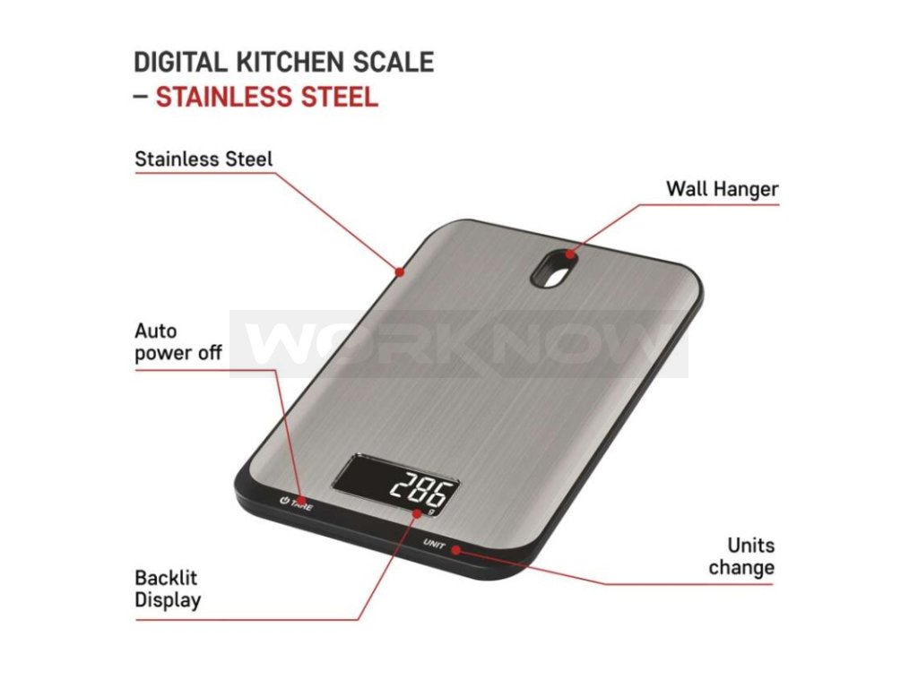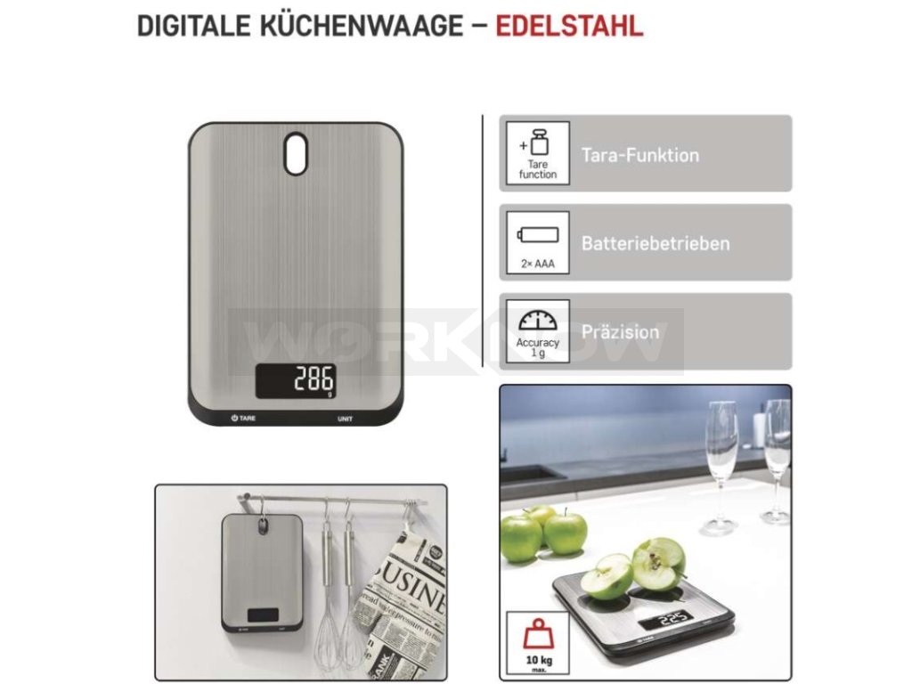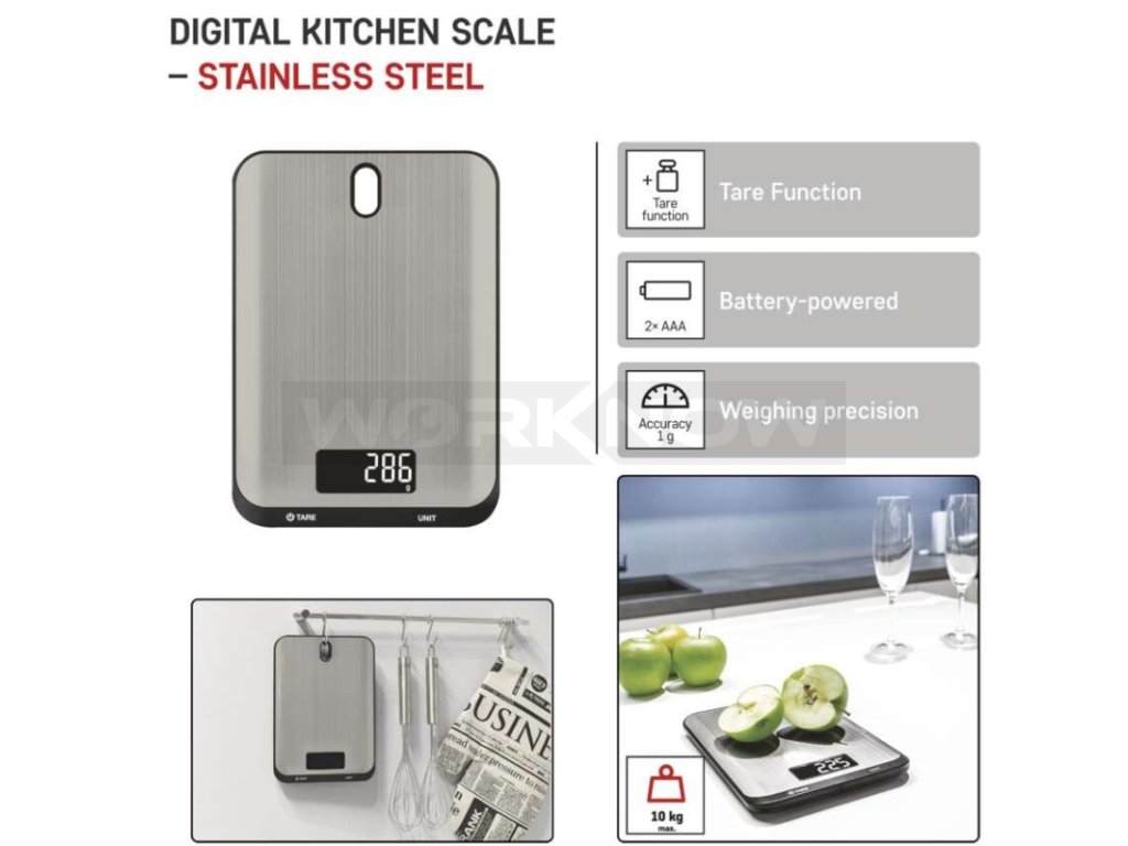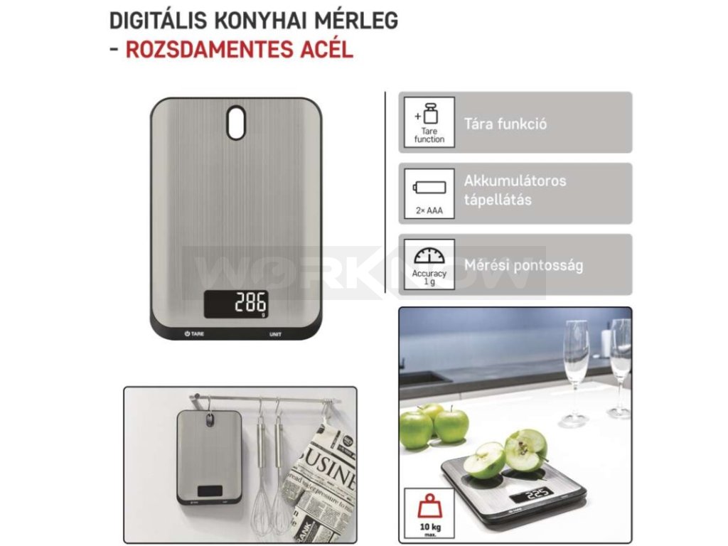 Maximální zátěž až 10 kg, podsvícený displej, dotyková tlačítka s rychlou odezvou, otvor pro zavěšení, nerezový povrch.