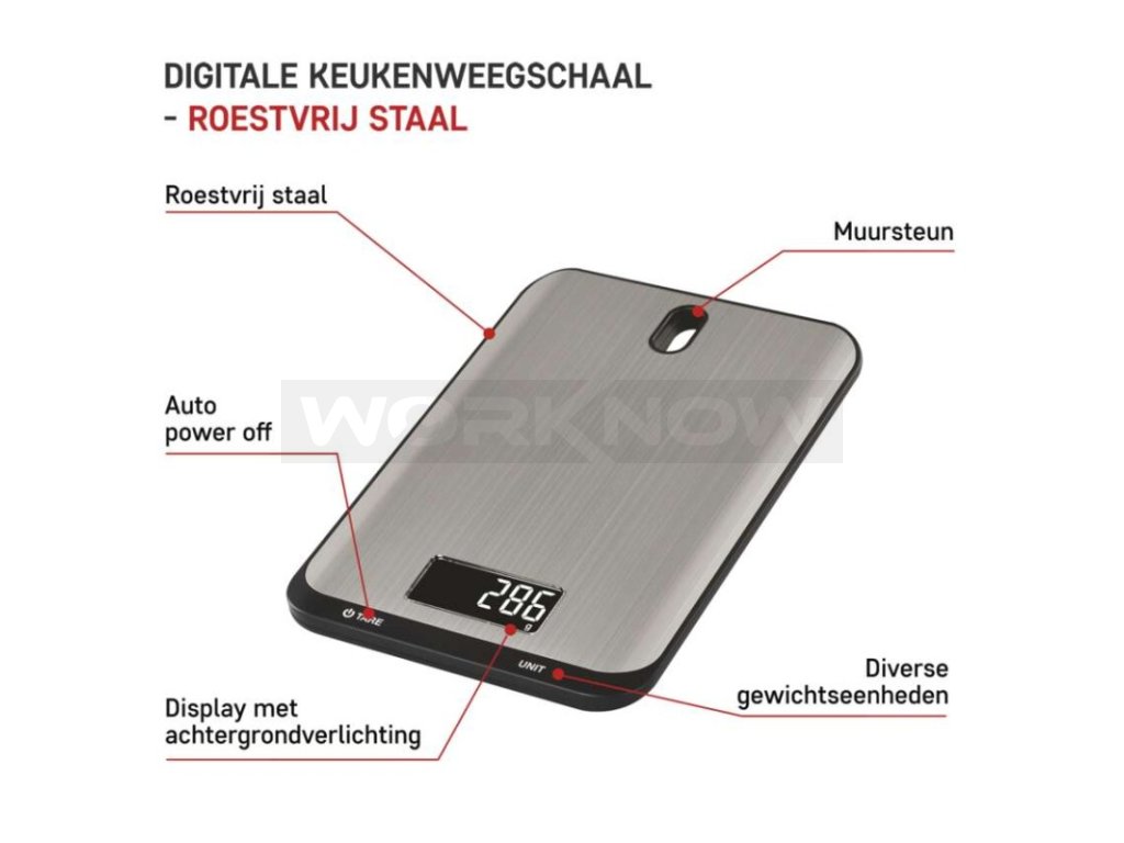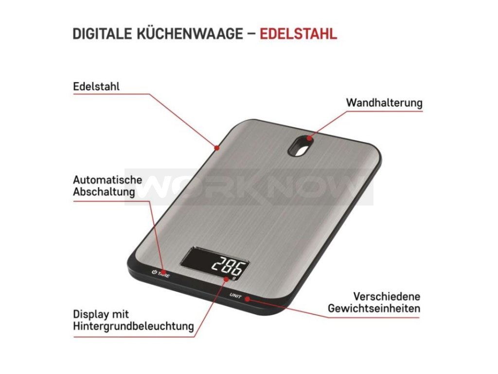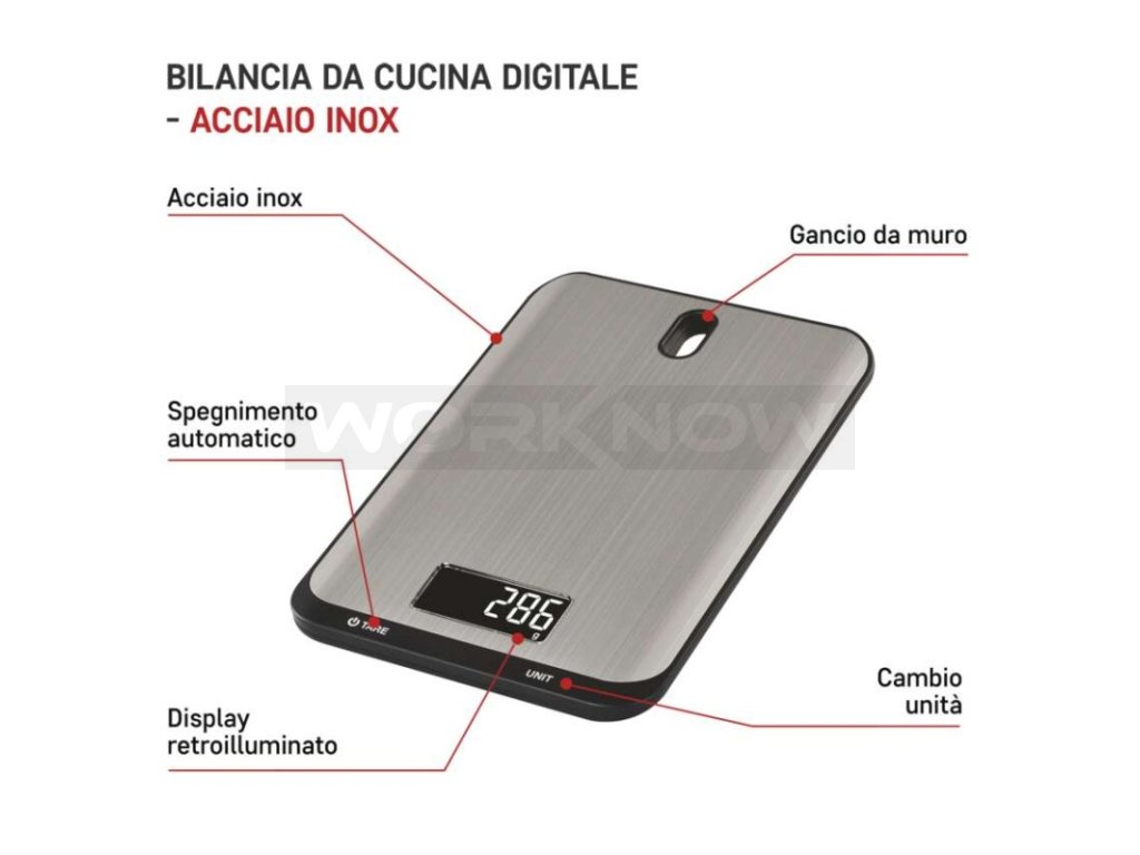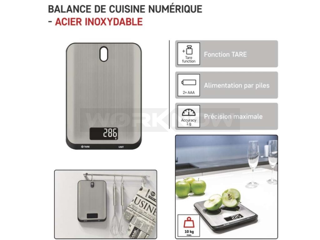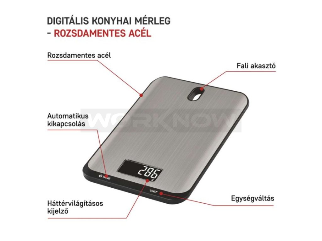 Maximální zátěž až 10 kg, podsvícený displej, dotyková tlačítka s rychlou odezvou, otvor pro zavěšení, nerezový povrch.