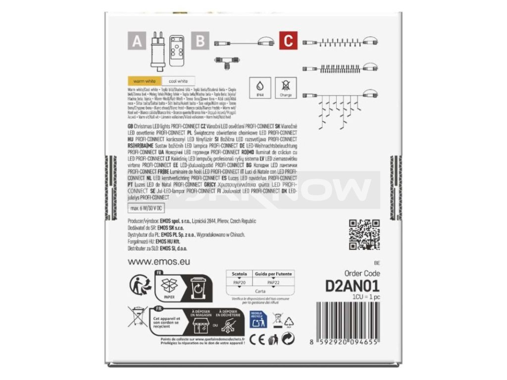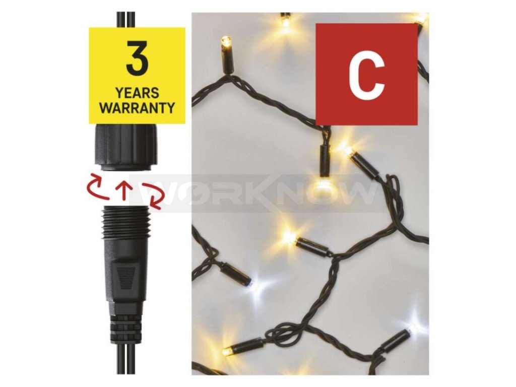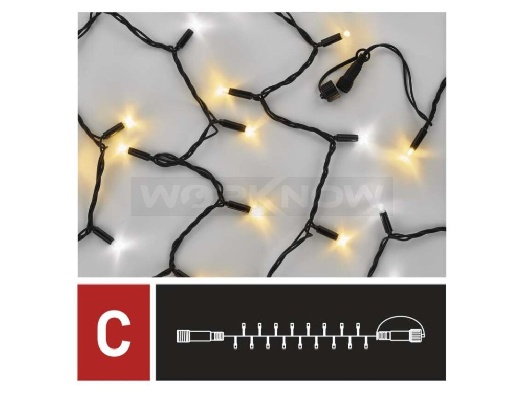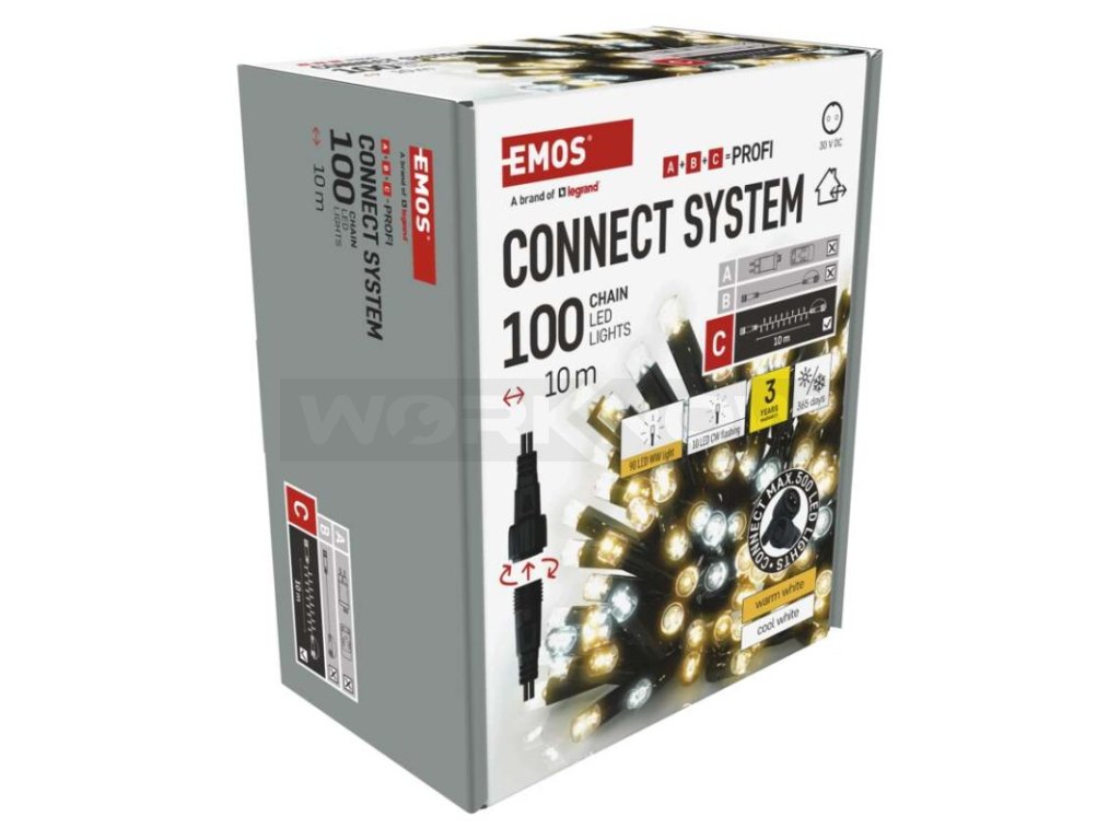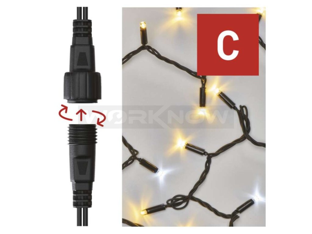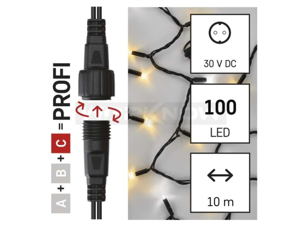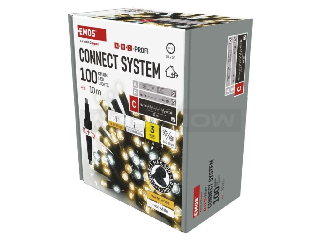 Propojovací systém CONNECT SYSTEM PROFI je díky stupni krytí IP44 vhodný k vnitřnímu i venkovnímu použití. Vyznačuje se zvýšenou odolností materiálu a prodlouženou zárukou 3 let. Vysoce kvalitní gumové kabely umožňují celoroční instalaci bez nutnosti demontáže za jakýchkoliv teplotních podmínek. Vybírat můžete ze standardních řetězů, krápníků a clusterů. Z jediného napájecího zdroje (A) připojeného k prodlužovacím kabelům, rozbočovačům (B) a světelným LED prvkům (C) je možné napájet až 500 LED světýlek.