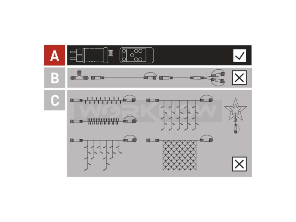 Jednotlivé světelné LED prvky (C) propojovacího systému CONNECT SYSTEM ve verzích STANDARD a PROFI je možné vzájemně propojovat, kombinovat a s využitím prodlužovacích kabelů a rozbočovačů (B) větvit a zdobit s nimi i vzdálenější místa. Postupným rozšiřováním o další komponenty je možné dosáhnout profesionálního a rozsáhlého osvětlení bez nutnosti vysoké počáteční investice. Propojovací LED osvětlení je tak ideální volbou pro velkolepou venkovní výzdobu, kde běžné délky řetězů nejsou dostačující. Instalaci systému zvládne skutečně každý.