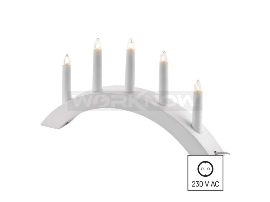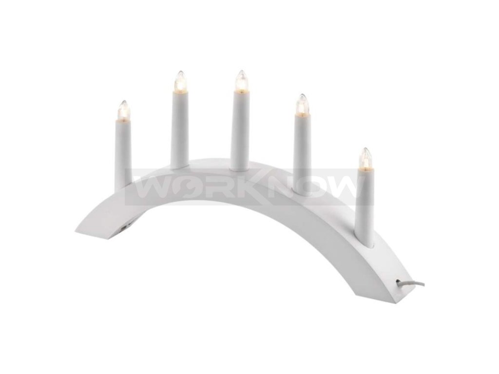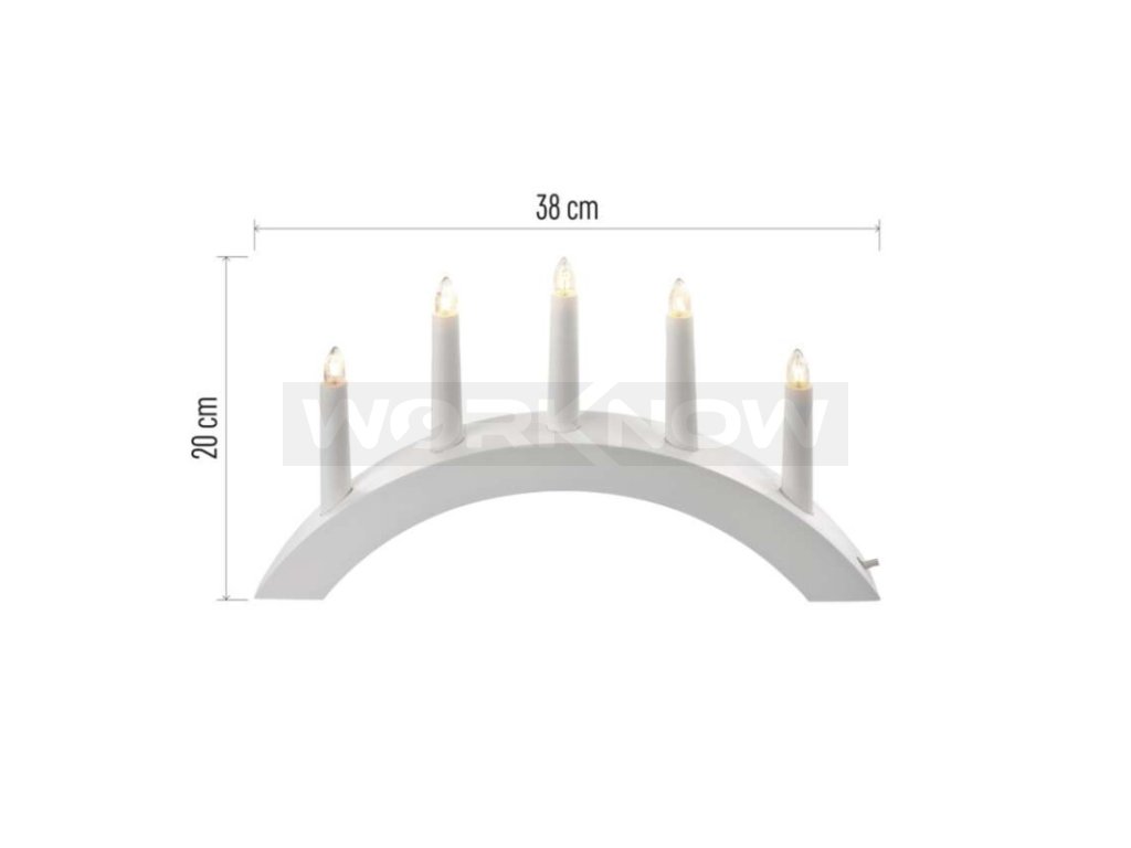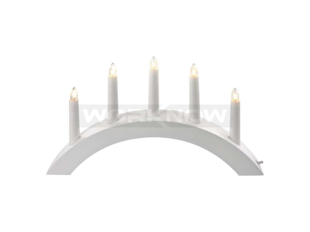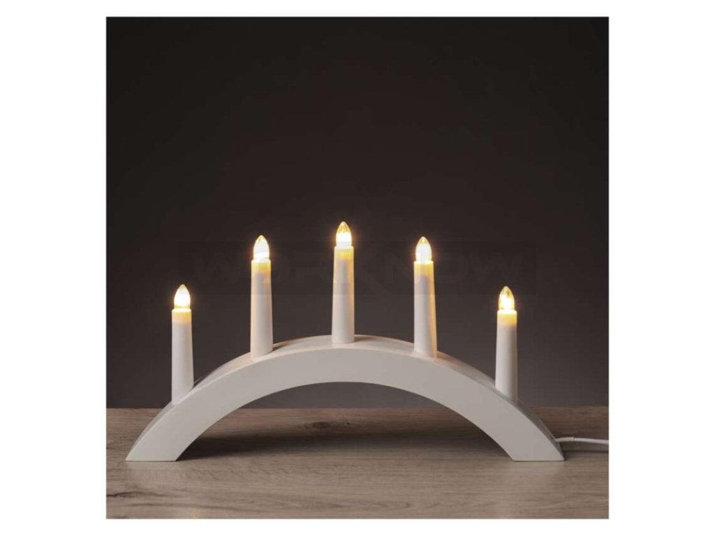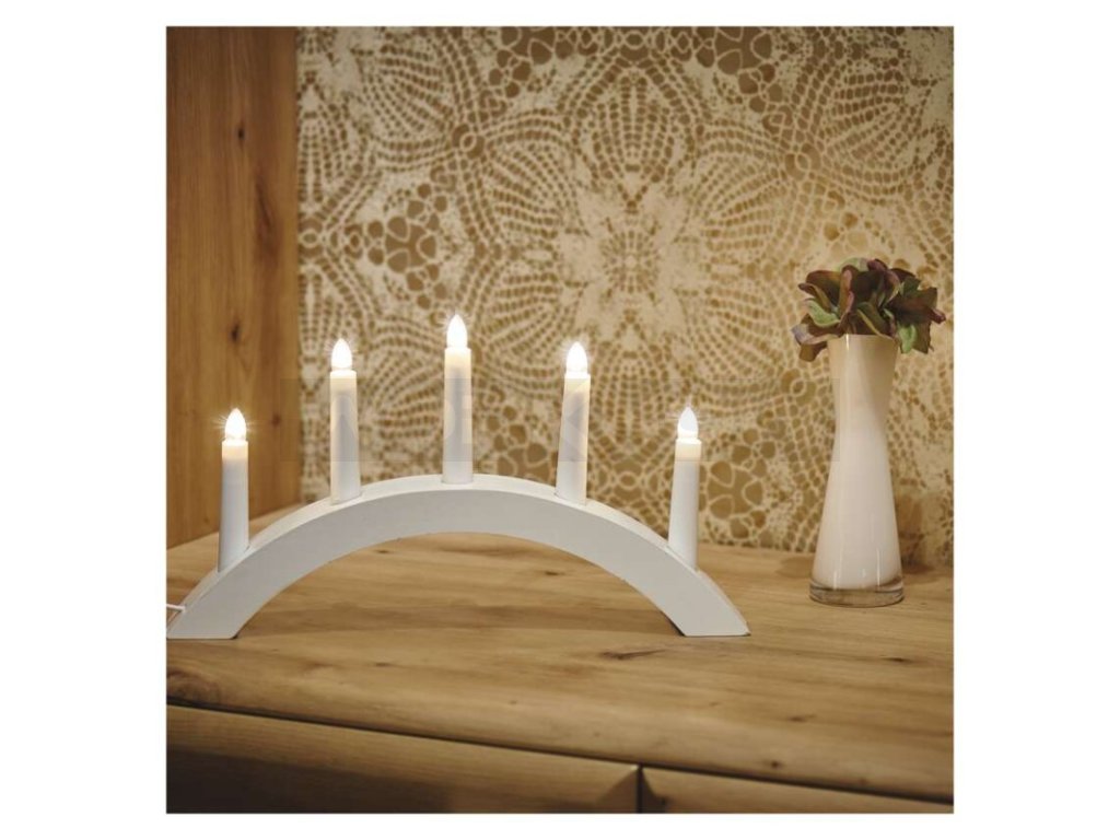 Svícen na 5x žárovičku E10 dřevěný bílý, oblouk, 20x38 cm, vnitřní, teplá bílá