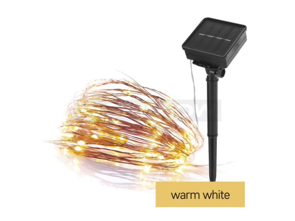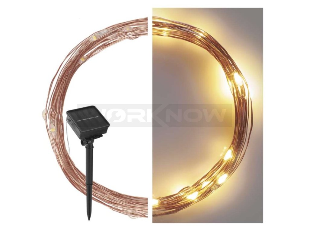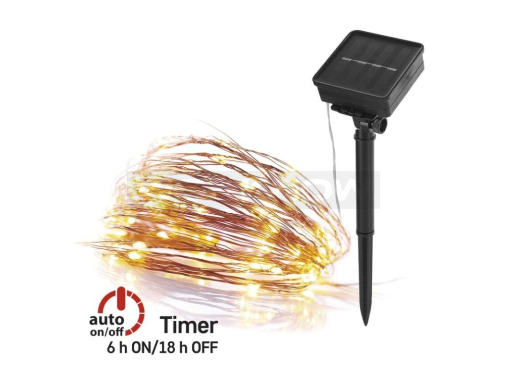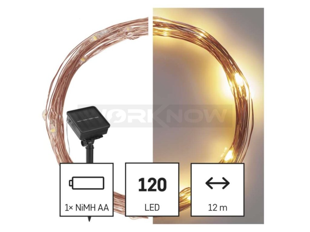 LED nano řetěz se solárním panelem, měděný, 12 m, venkovní i vnitřní, teplá bílá, časovač