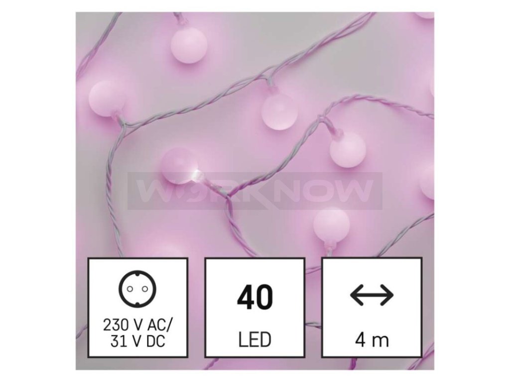 LED světelný cherry řetěz – kuličky 2,5 cm, 4 m, venkovní i vnitřní, růžová, časovač