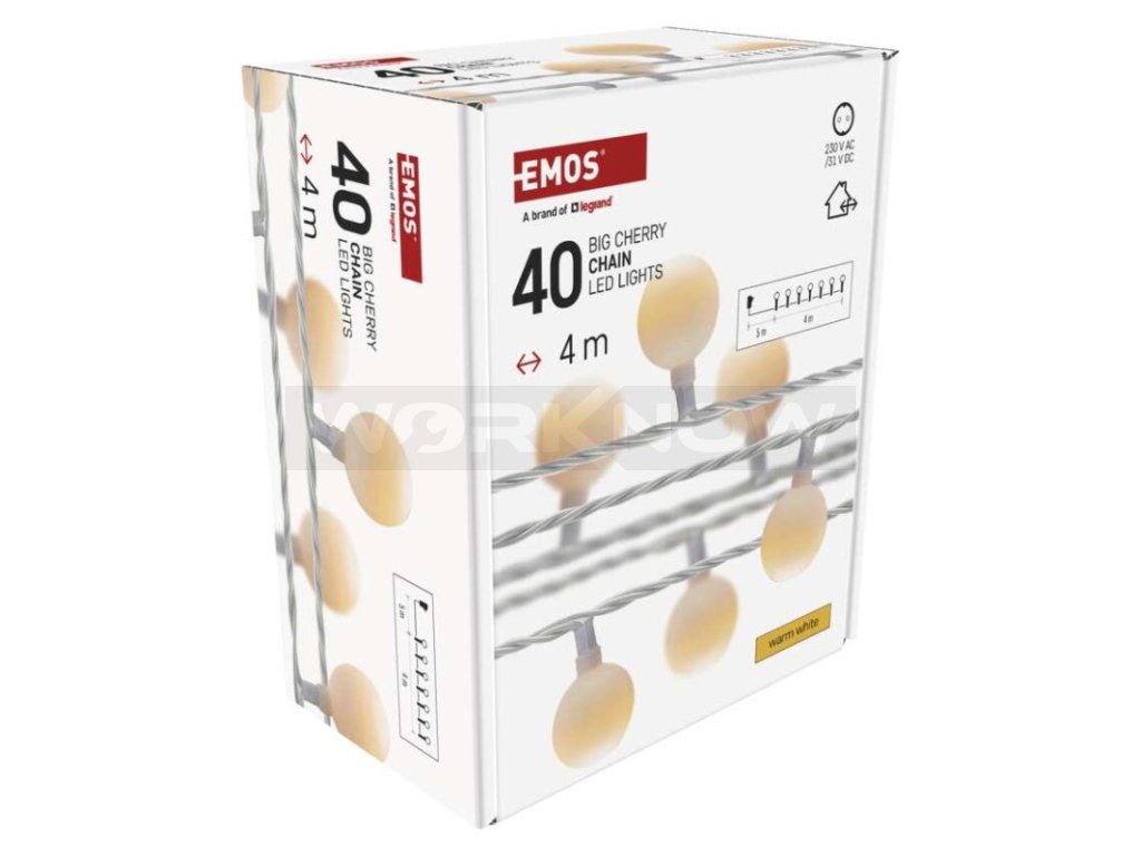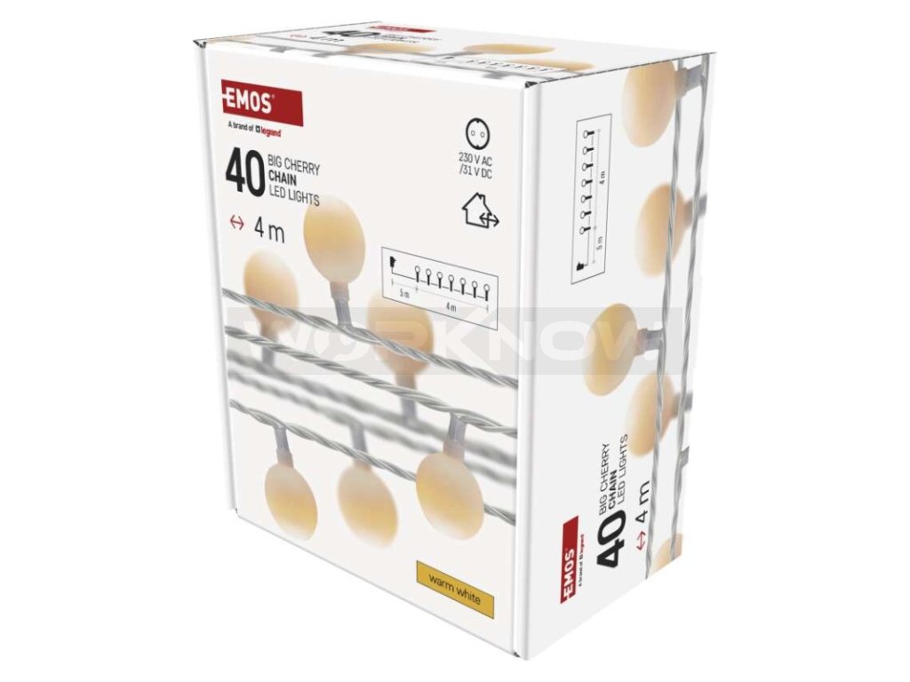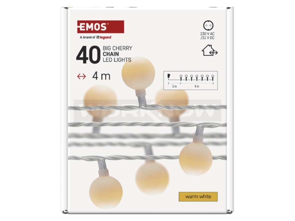 Řetězy CHERRY – s velkými kuličkami nabízejí širokou škálu použití nejen při tvorbě vánoční výzdoby a atmosféry. Jejich LED světýlka jsou schovaná v kuličkách o průměru 2,5 cm, které jsou ozdobou i ve chvílích, kdy řetěz nesvítí. Na základě zvolené délky a barvy světla se postarají o ozdobení malých dekorací v interiéru, rozsvícení vánočního stromečku i většího stromu na zahradě. Skvěle se hodí pro vytvoření slavnostní atmosféry na rodinné oslavě, svatbě nebo dětské párty. Všude tam mohou během dne bílé kuličky vypnutého řetězu CHERRY sloužit jako dekorace, která se po setmění rozzáří a navodí tu pravou atmosféru. Řetězy CHERRY jsou tak doslova dva v jednom.