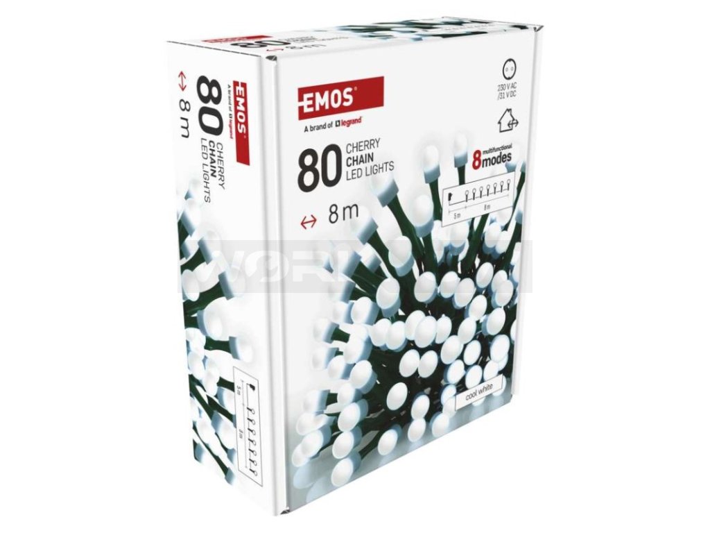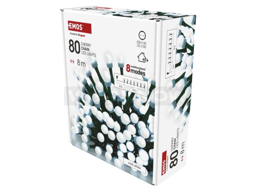 LED vánoční cherry řetěz – kuličky, 8 m, venkovní i vnitřní, studená bílá,programy,časovač