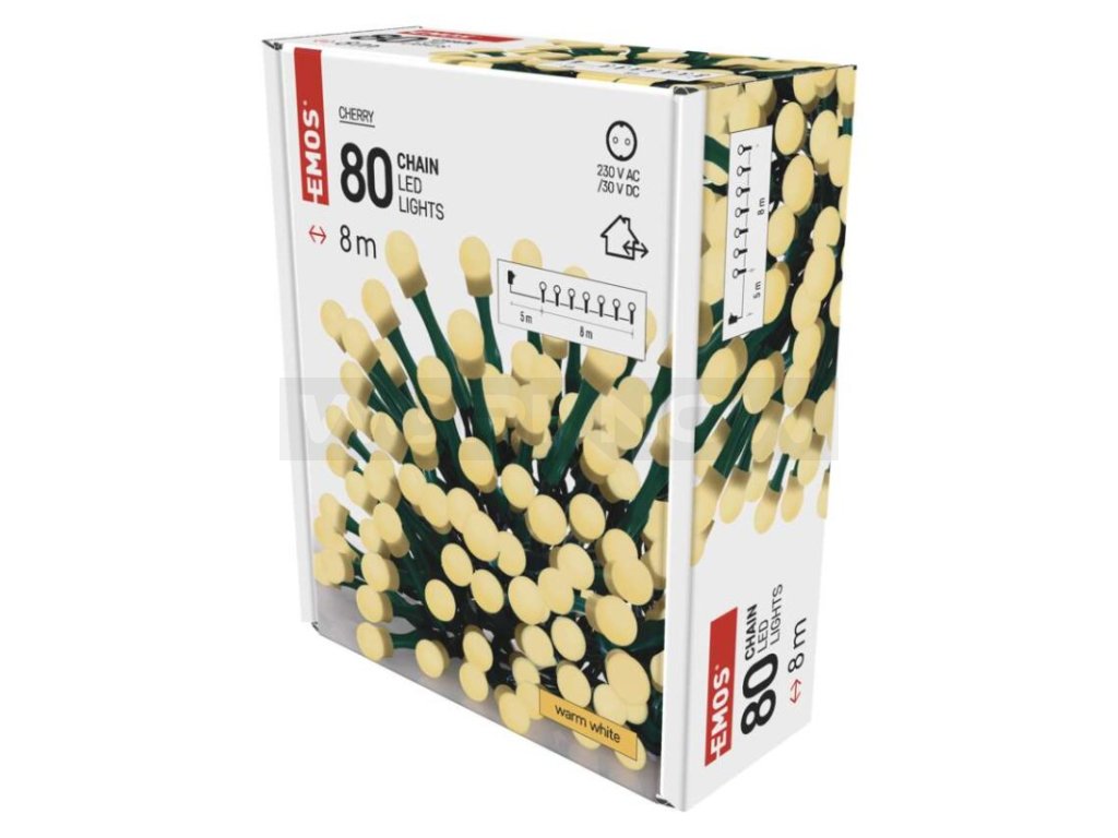 Řetězy CHERRY – standard nabízejí širokou škálu použití nejen při tvorbě vánoční výzdoby a atmosféry. Jejich LED světýlka jsou schovaná v malých bílých kuličkách, které jsou ozdobou i ve chvílích, kdy řetěz nesvítí. Na základě zvolené délky a barvy světla se postarají o ozdobení malých dekorací v interiéru, rozsvícení vánočního stromečku i většího stromu na zahradě. Skvěle se hodí pro vytvoření slavnostní atmosféry na rodinné oslavě, svatbě nebo dětské párty. Všude tam mohou během dne bílé kuličky vypnutého řetězu CHERRY sloužit jako dekorace, která se po setmění rozzáří a navodí tu pravou atmosféru. Řetězy CHERRY jsou tak doslova dva v jednom.