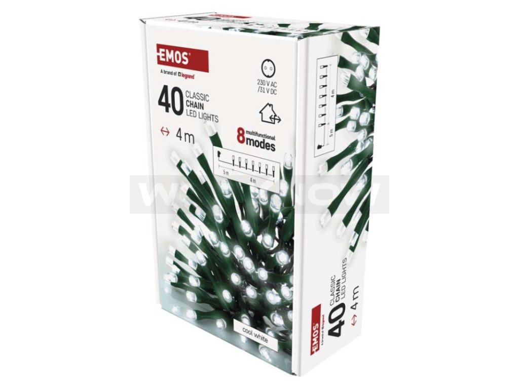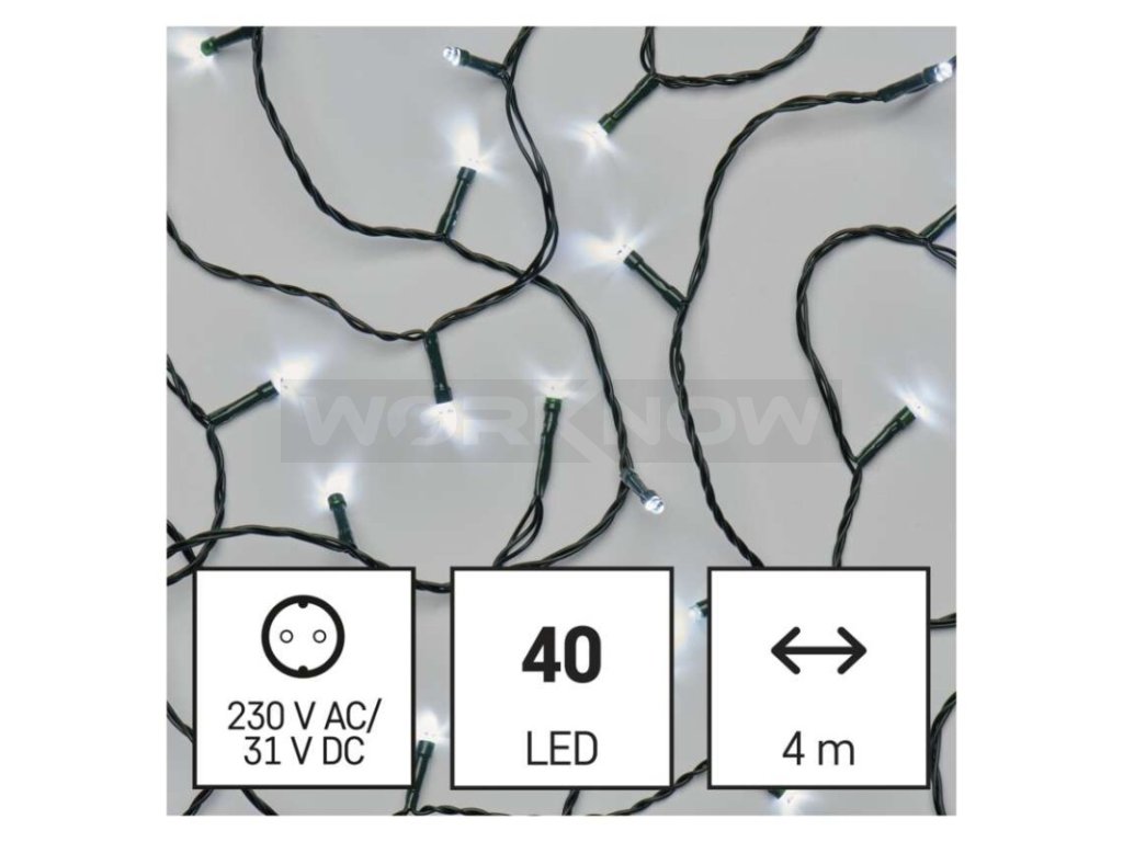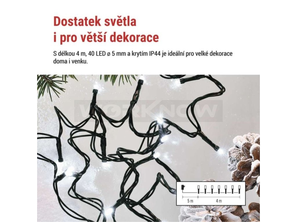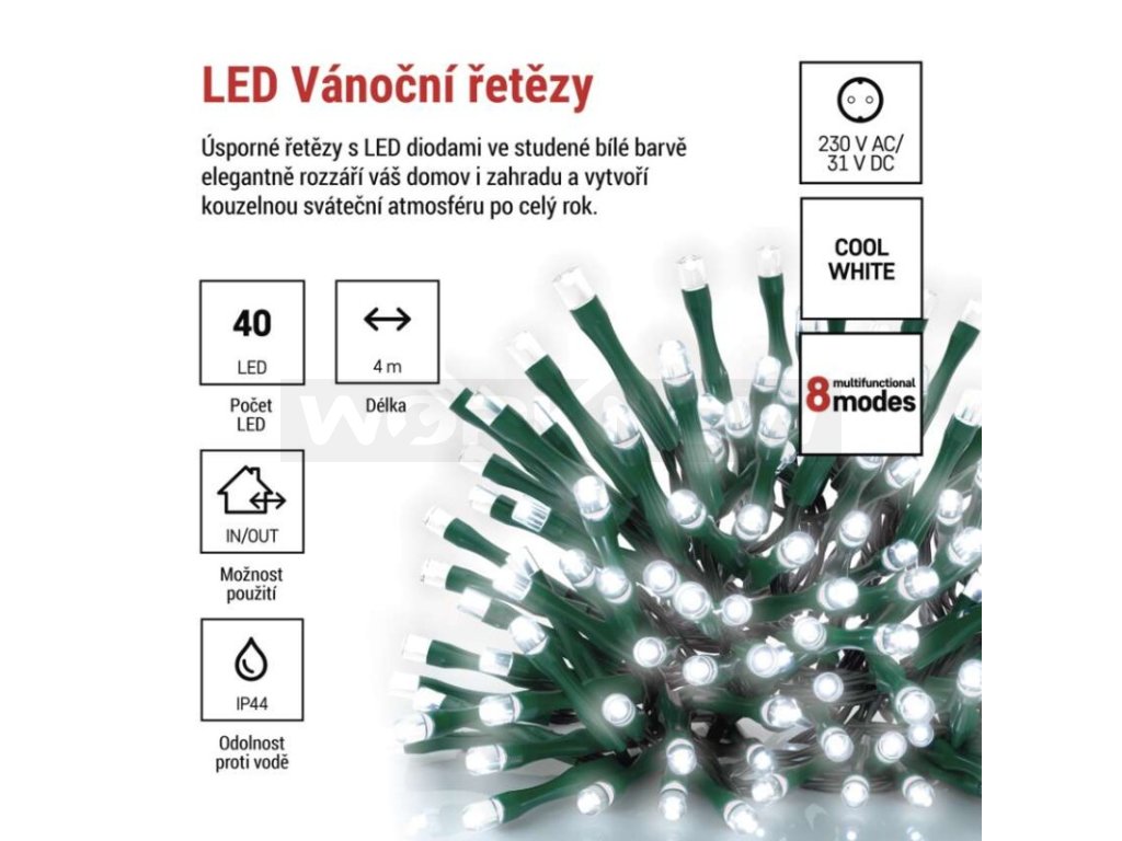 LED vánoční řetěz, 4 m, venkovní i vnitřní, studená bílá, programy, časovač