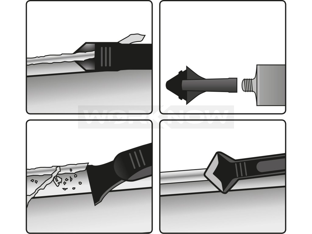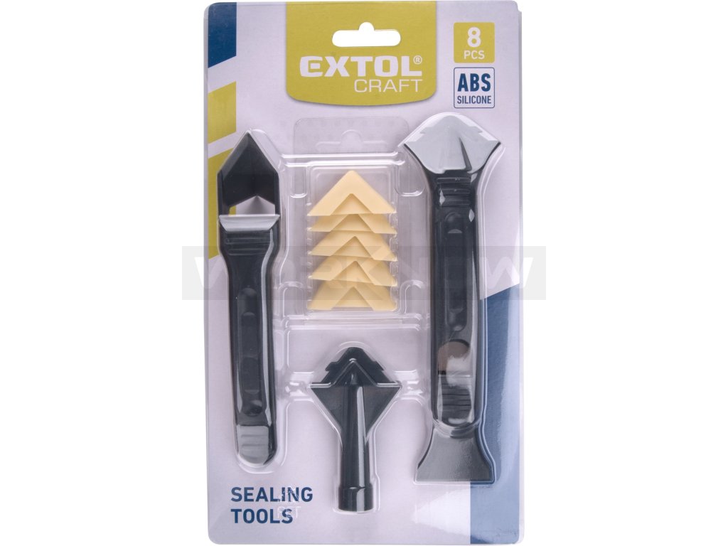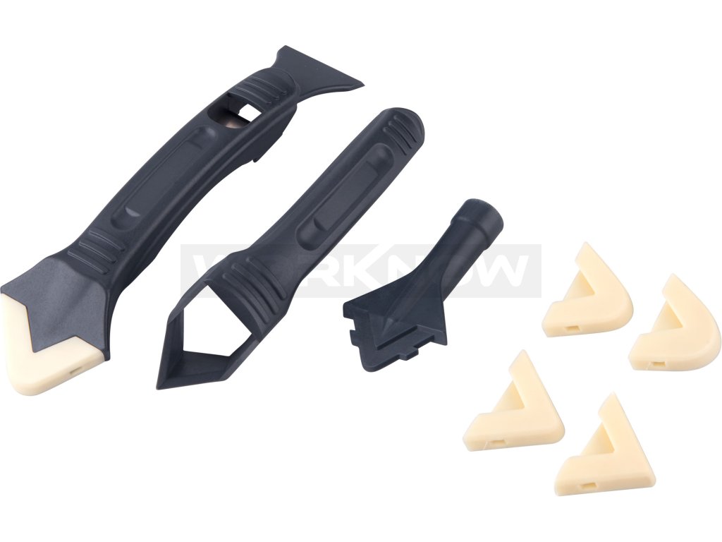- sada obsahuje pět silikonových nástavců na vyhlazení tmelu s rádiusy v mm R3-R6-R10-R13-R17 (tyto lze nasadit do nástavce na kartuše nebo na druhý konec ručky se škrabkou); sada dále obsahuje nástavec na kartuše, ručku na silikonové nástavce se škrabkou a ručku s rohovým seřezávačem tmelu s čistícím trnem