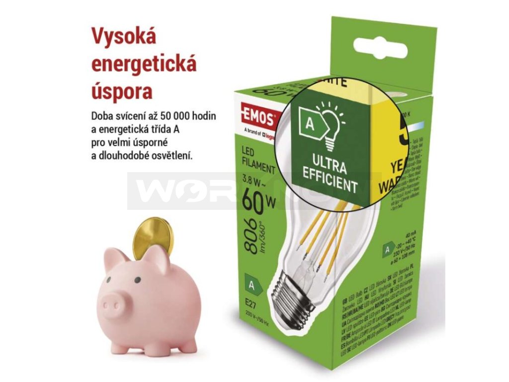 Ultra Efficient; Energetická třída A – úspora energie/peněz; Nová technologie kvalitnějších LED čipů; Záruka 5 let – jako první v sortimentu; Dlouhá životnost 50 000 h – vydrží až 2násobně oproti běžným filamentovým žárovkám; Úspora až 40 %.