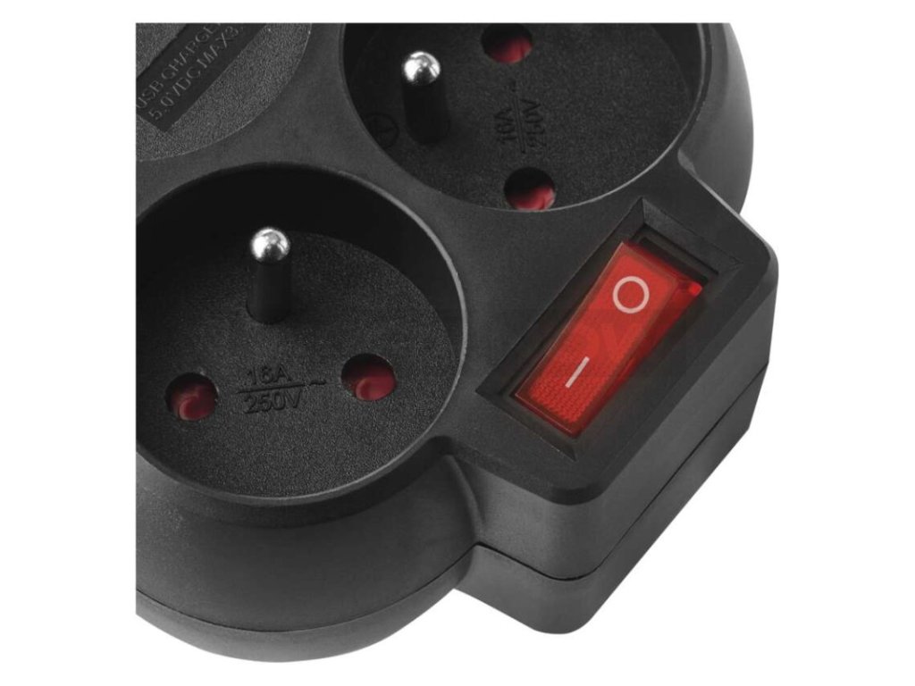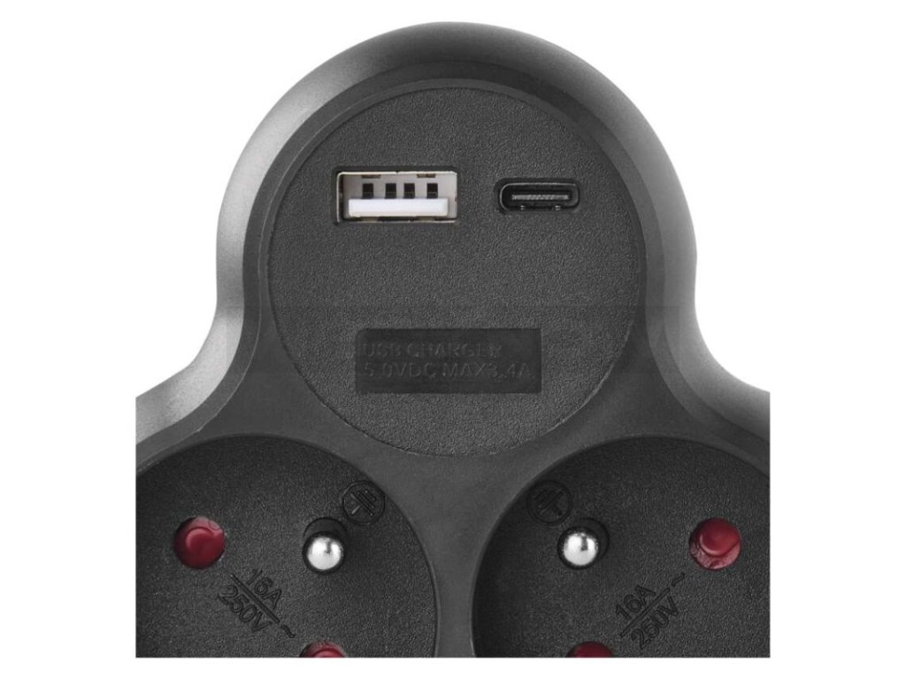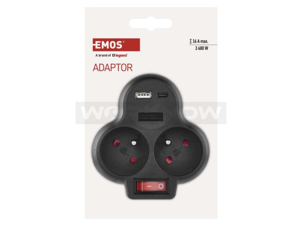 Adaptor dvojnásobný rozbočovací s vypínačem a USB výstupem A+C. Max. ∑16 A. 2× USB ∑3,4 A max (17W).
