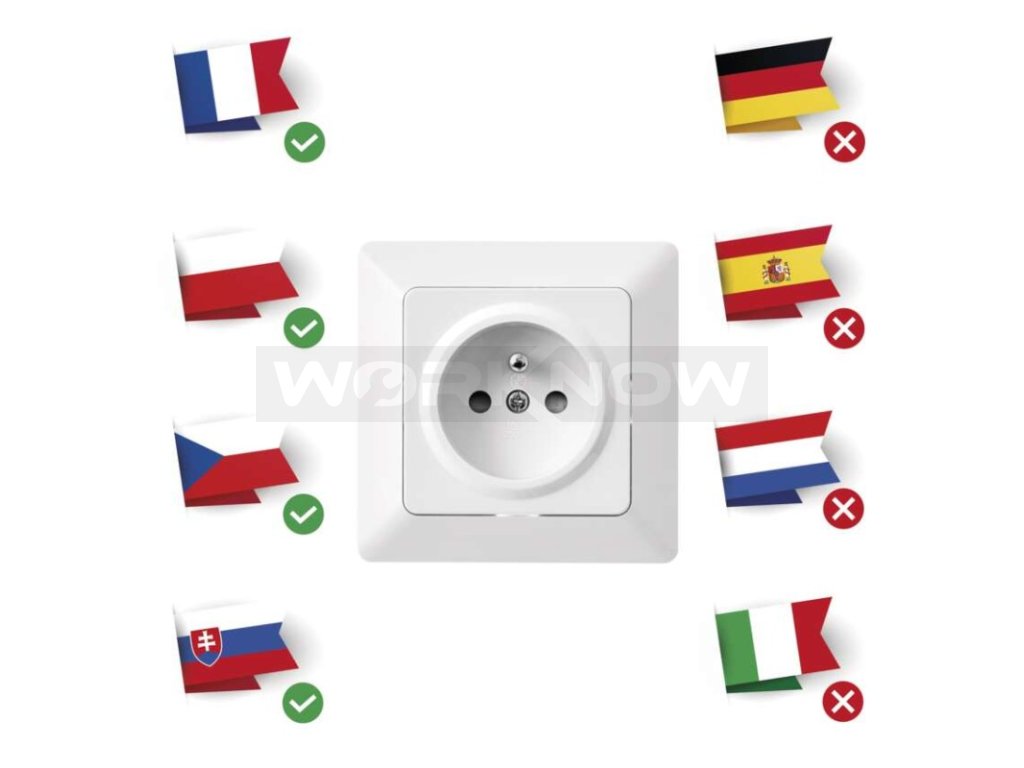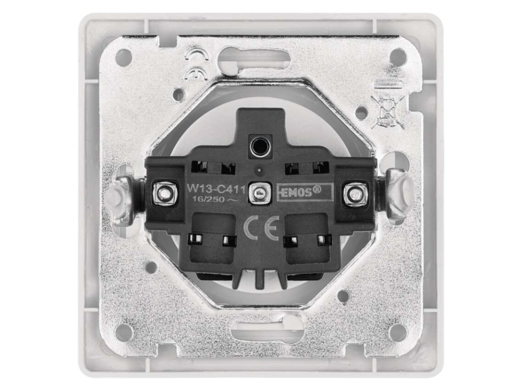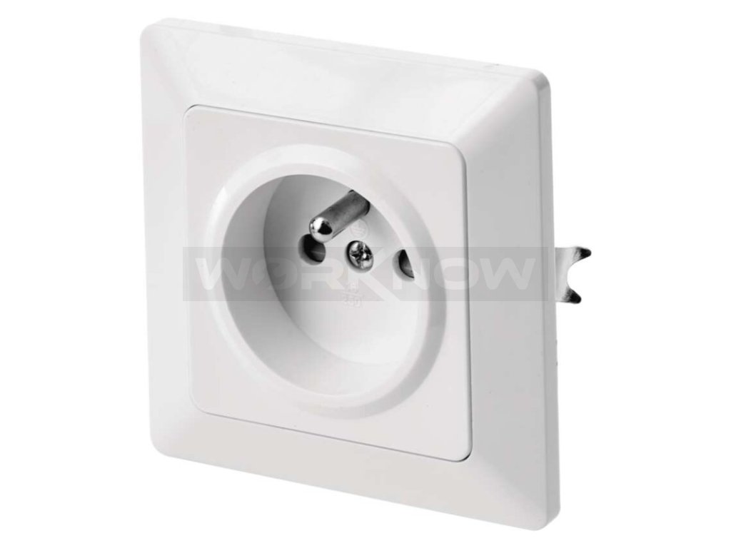 Kvalitní jednonásobná FRENCH zásuvka s integrovanou dětskou clonkou. Montáž do krabice. IP20. Šroubové svorky.
