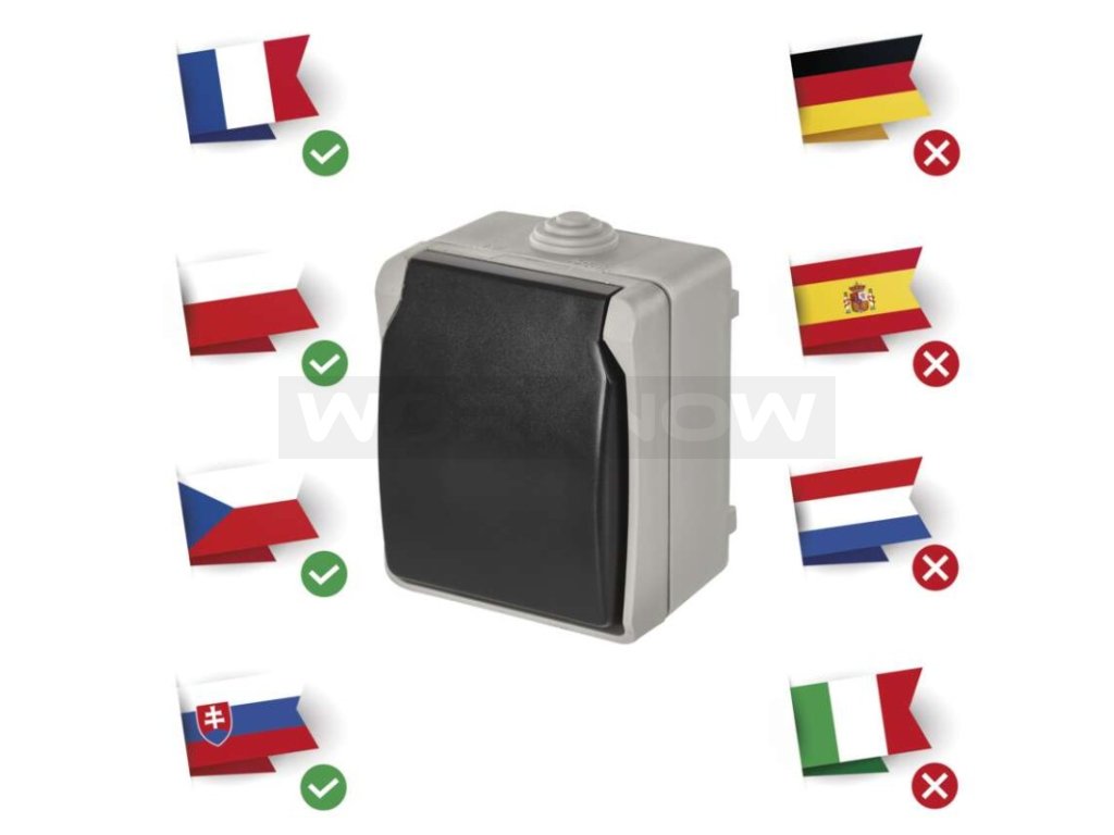 Kvalitní nástěnná voděodolná FRENCH zásuvka s ochraným víčkem.