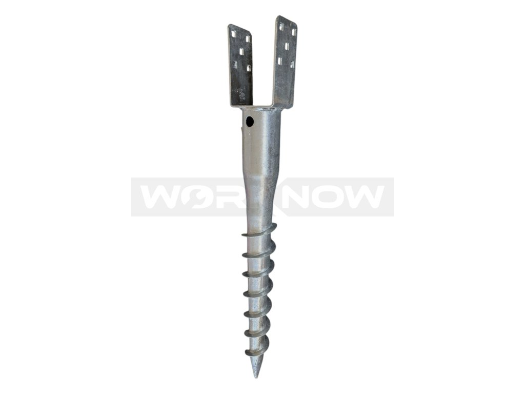 Ocelový zemní vrut s povrchovou úpravou v žárovém zinku ukončený patkou ve tvaru „U“. Jedná se o zemní vrut konstruovaný k usazení různých typů dřevěných konstrukcí. Vrut je uzpůsoben pro montáž trámů přímo do patky, která je opatřena montážními otvory pro šrouby.
