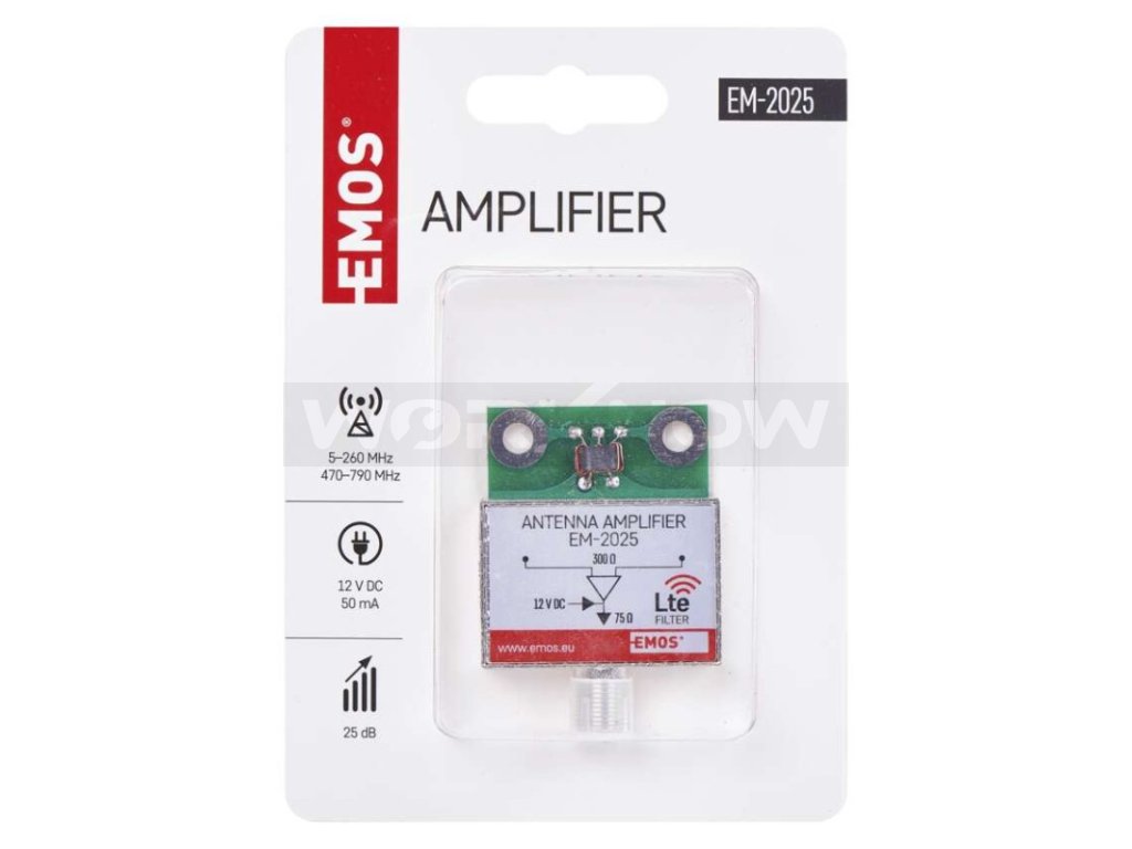 BEN-025 předzesilovač je určen pro montáž do anténní krabičky se zesílením 25 dB. Zesilovač je v kovovém krytu čímž odrušuje vnější vlivy a je zakončen konektorem F. Pracuje v pásmu BIII, IV, V a má certifikaci CE. Rozteč děr je 27 mm.