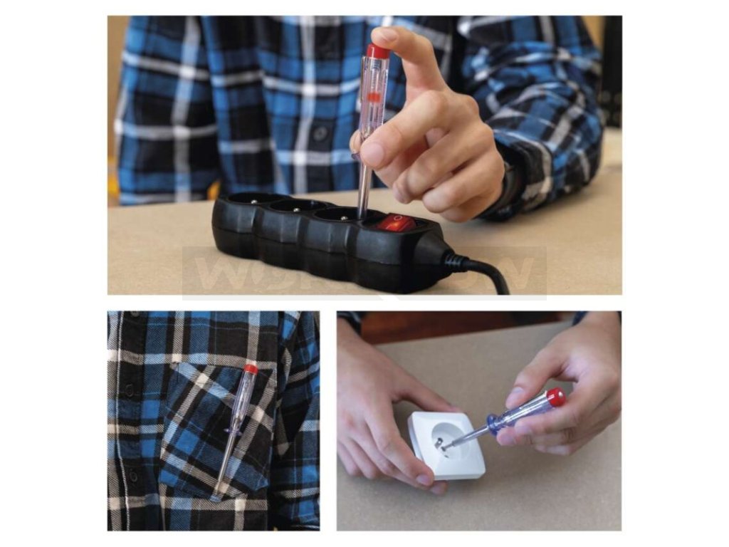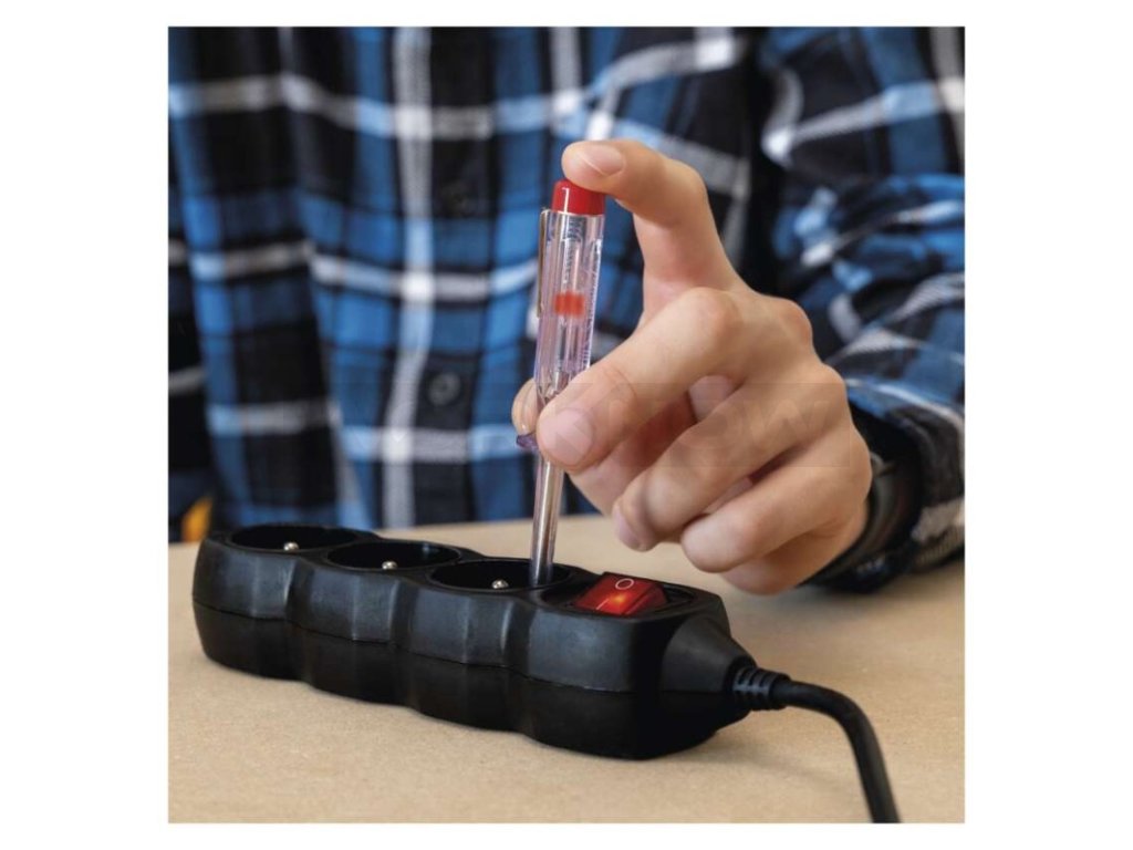 Zkoušečka napětí s optickou signalizací. Zkoušečka je určena ke zjišťování střídavého napětí 200–250 V a stejnosměrného napětí 0–250 V.